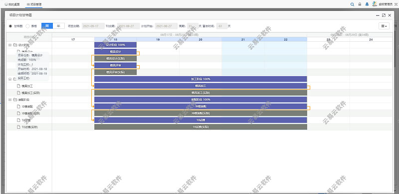 可導入項目計劃模板后快速生成,根據任務間的先后依賴關系,自動計算項目各任務的完成時間節點、項目周期、富余時間等相關計劃信息。可以查詢項目的大日程計劃,也可以查看項目的加工進度計劃,也可以用甘特圖查看。
